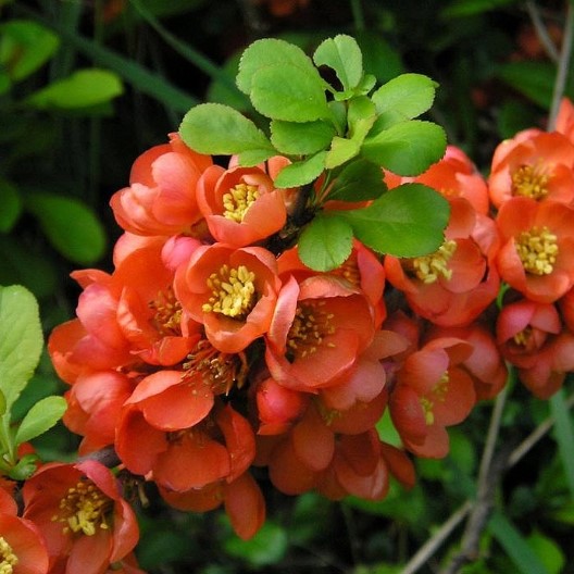 Айва японская 'Везувиус' — компактный декоративный кустарник до ~1 м в высоту с широкой кроной до 1,5 м. Медленно растущий, неприхотливый вид, который стойко переносит низкие температуры — действительно морозостойкий вариант для регионов с суровой зимой. Весной обильно покрывается шарлахово-красными цветами до 3 см, листья весной бронзовые, летом — насыщенно зелёные; декоративность сохраняется весь сезон.